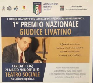 Mercoledì 21 marzo, presso il teatro Sociale di Canicattì, si è svolta la manifestazione per l’assegnazione del Premio Nazionale “Giudice Livatino”, organizzata dal Comune di Canicattì in collaborazione con l’Associazione Italiana Arbitri e la sezione di Agrigento.